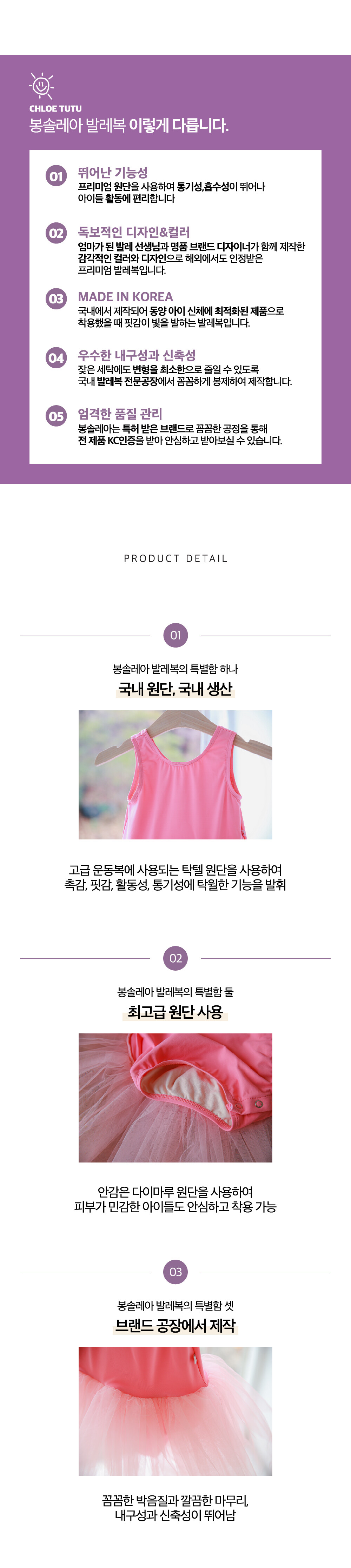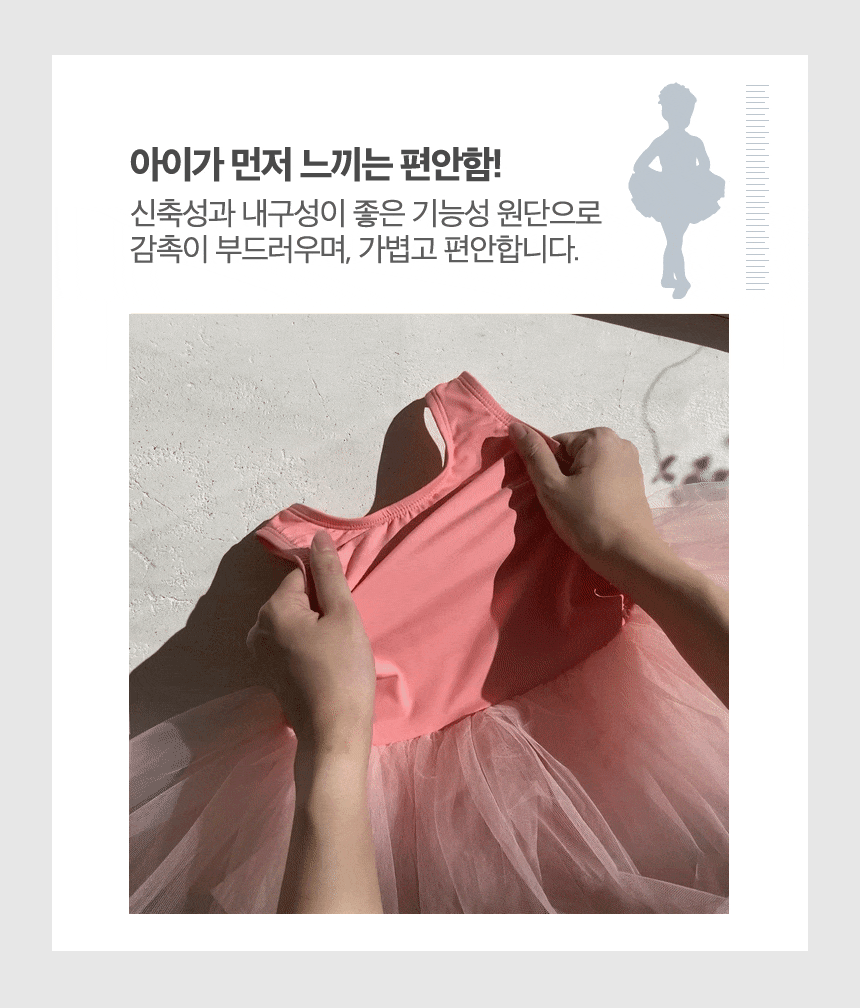 최고급 탁텔원단을 사용하여 부드러운 촉감, 편안한 착용감, 땀흡수와 통기성에 탁월한 기능을 발휘하게 제작된 발레복입니다.