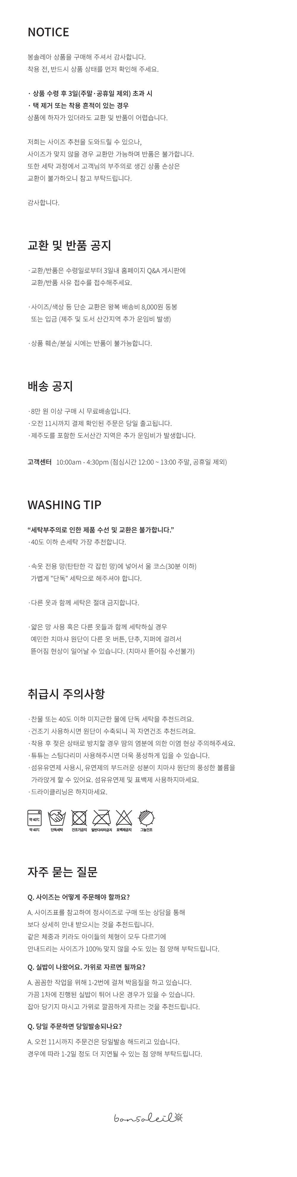 “세탁부주의로 인한 제품 수선 및 교환은 불가합니다.”
